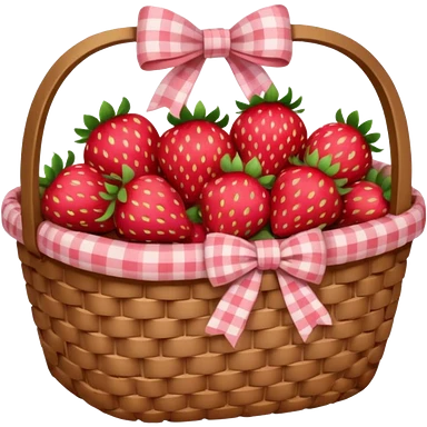 Cottagecore strawberries in a basket, with a pale pink plaid cute ribbon. No emoji faces, no emoji icons emoji