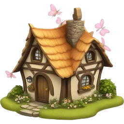 A cozy fantasy cottage made of stone and wood, covered in moss, vines, and flowers. The windows are aglow with firelight. emoji