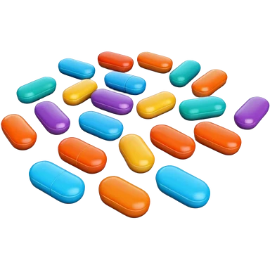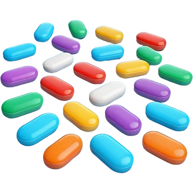 A group of colorful 3D cartoon pills scattered on a flat surface, round and oval shapes, soft lighting, smooth glossy finish, Memoji-style realism. emoji