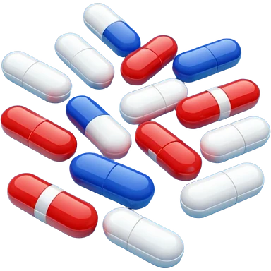 A close-up of mixed pills and capsules, red, white, and blue colors, clean background, light reflections on surface, realistic Memoji-style. emoji
