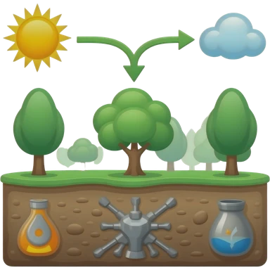 ecosystems and draw arrows from sun to trees from tress to fossil fuels inside ground and arrow from that to air emoji