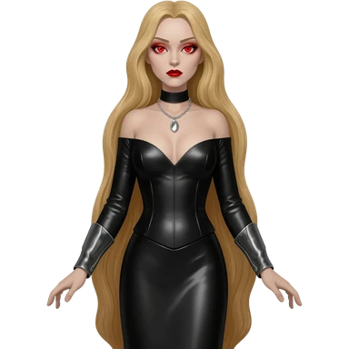 Countess Dracula with red eyes, long blonde hair, black metallic long dress, silver necklace emoji