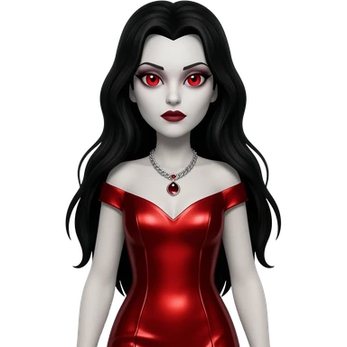Countess Dracula with red eyes, long black hair, red metallic long dress, silver necklace emoji