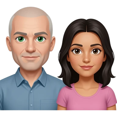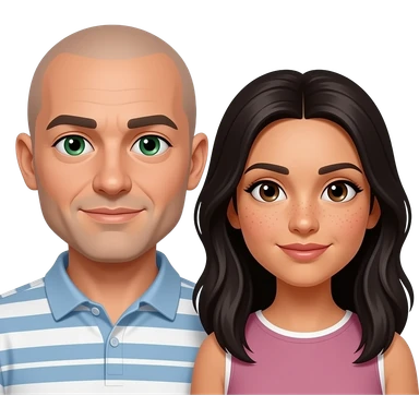 Couple. Bald man with green eyes, Hispanic woman with many small faded, freckles and dark hair. emoji