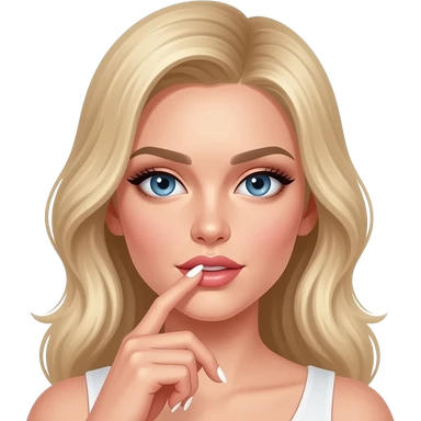 Femme blonde yeux bleu bien maquillée avec ongles fait, main avec un doigt dans à la bouche emoji