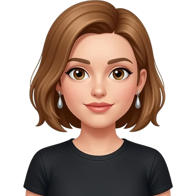 femme cheveux chatains blonds au carré, raie sur le côté droit, yeux marrons, lèvres fines, t-shirt noir, boucles d'oreilles pendantes en argent, g emoji