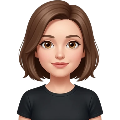 femme cheveux chatains clairs au carré, raie sur le côté droit, yeux marrons, lèvres fines, t-shirt noir emoji