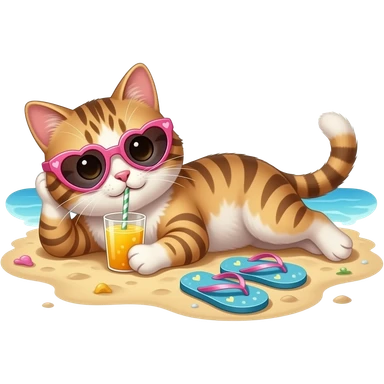A cat laying on the beach and it's hands under it's head with pink heart sunglasses wearing cute flipflops drinking juice emoji