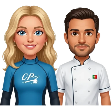 Couple emoji. She's dutch, 1,89m, surfer, blonde. He's portuguese, 1,79m, chef, short beard and hair, two small hoop earrings emoji