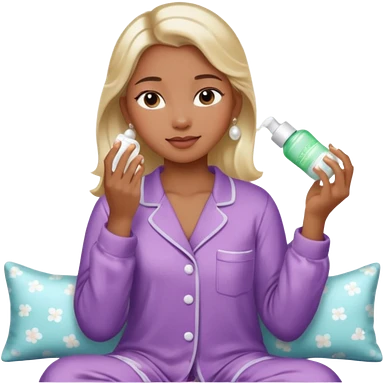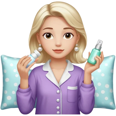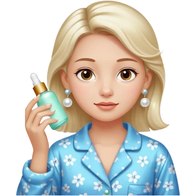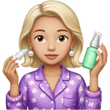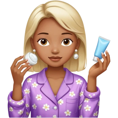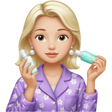 Clean girl aesthetic emoticons, apply skincare products, pearl earrings, glowing skin, pajamas, soft lighting emoji