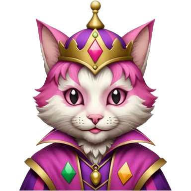 court jester cat medieval, single poker card joker clearly visible, pink, face only emoji