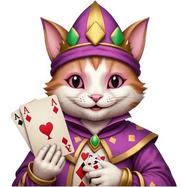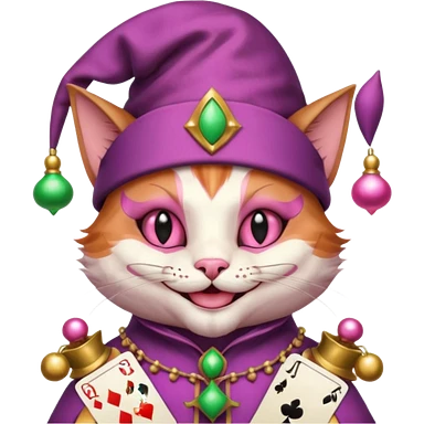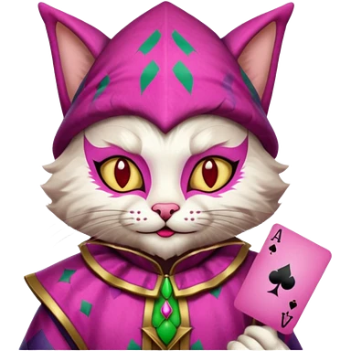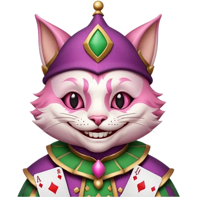 court jester cat medieval, single poker card joker clearly visible, pink, face only emoji