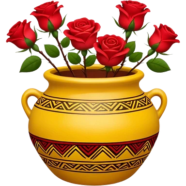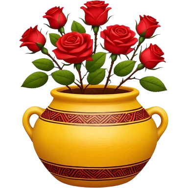 Yellow ceramic pot with red roses; the pot is decorated in an ethnic style. emoji