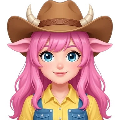 Cowgirl anime lady with horns, pink hair, pink cow ears, pastel yellow shirt, light blue eyes emoji