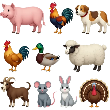 Cow, pig, rooster, dog, duck, cat, chicken, sheep, goat, mouse, rabbit, and a turkey emoji
