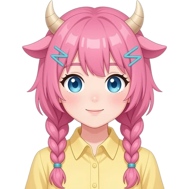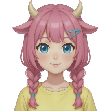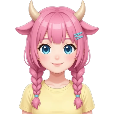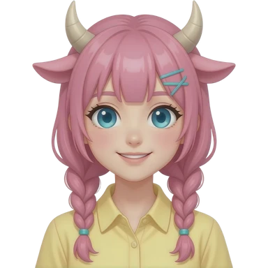 Cute pretty anime lady with horns, pink braided hair with cyan hair ties, pink cow ears, pastel yellow shirt, light blue eyes emoji