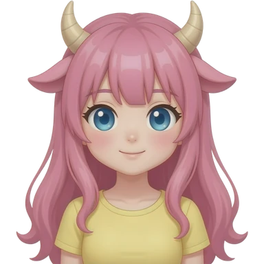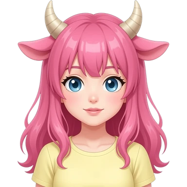 Cute pretty anime lady with horns, pink hair, pink cow ears, pastel yellow shirt, light blue eyes emoji