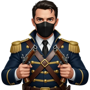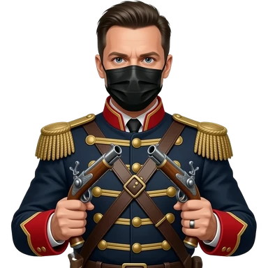 realistic cinematic Adam Ant with black mask is wearing a Hungarian Hussar'S JACKET, holds two firelocks holsters in his hands emoji