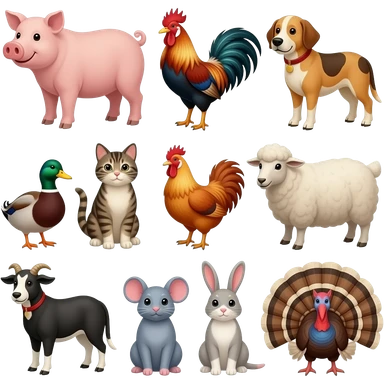 Cow, pig, rooster, dog, duck, cat, chicken, sheep, goat, mouse, rabbit, and a turkey emoji | AI Emoji Generator