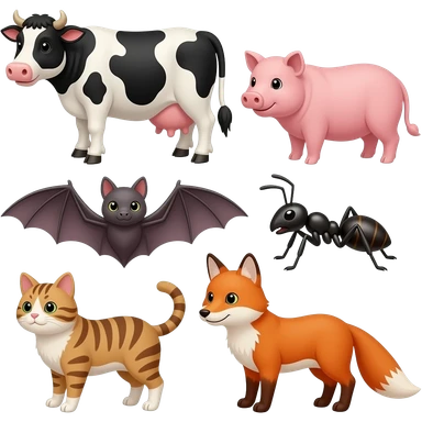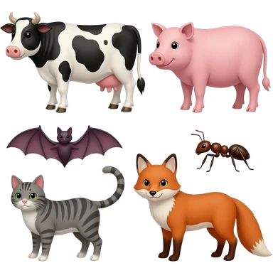 Cow pig, bat, ant, cat, fox emoji