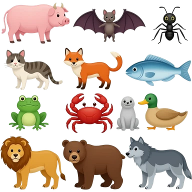 Cow, pig, bat, ant, cat, fox, fish, frog, crab, seal, duck, Lion, Bear, wolf, emoji