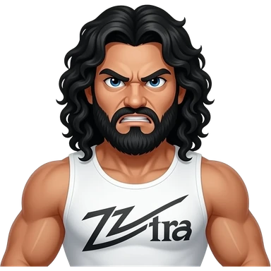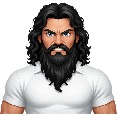 TEXICAN OUTLAW, with a ZZ Top beard, long, black, curly hair, super muscular, with angry eyes, beard is black too, wearing all white emoji