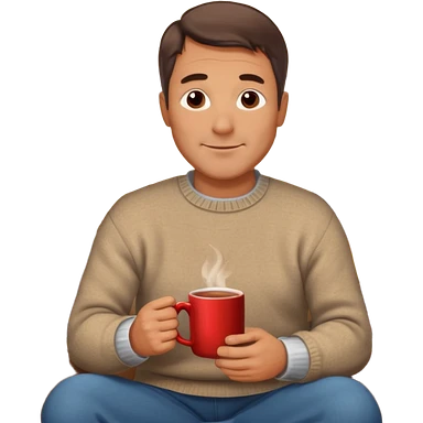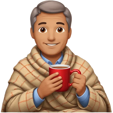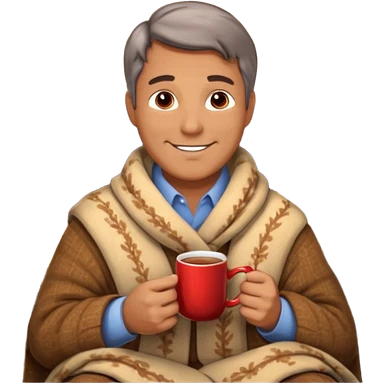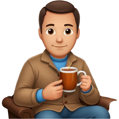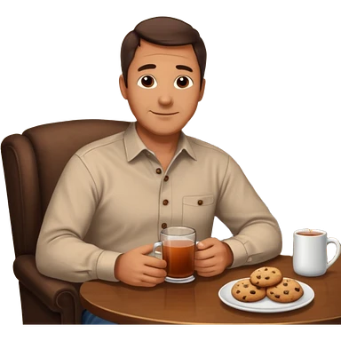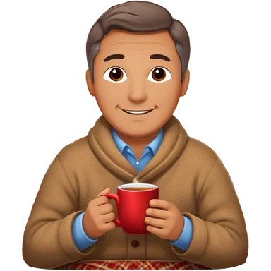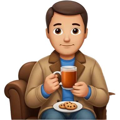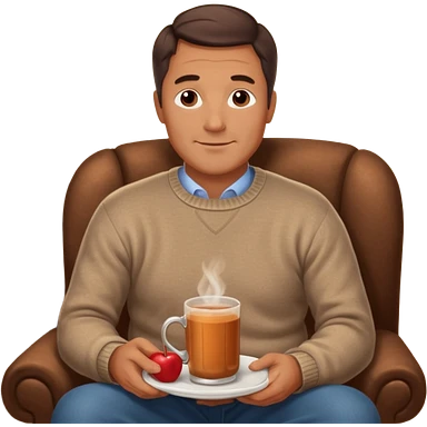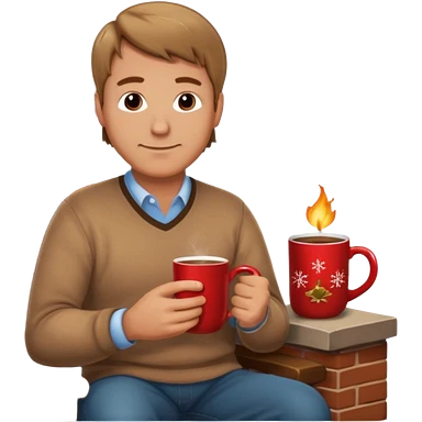 Cozy handsome middle aged man sitting next to a nice fireplace with a hot apple cider, blanket, and plate of chocolate cookies. emoji