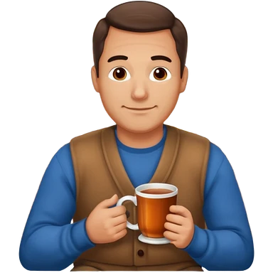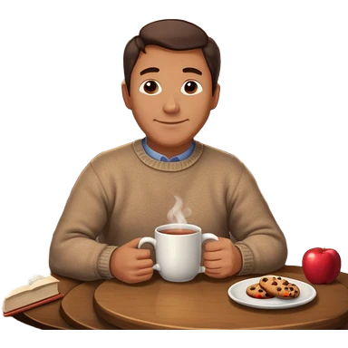 Cozy handsome 45 year old man sitting next to a nice fireplace with a hot apple cider, book, and plate of chocolate cookies. emoji