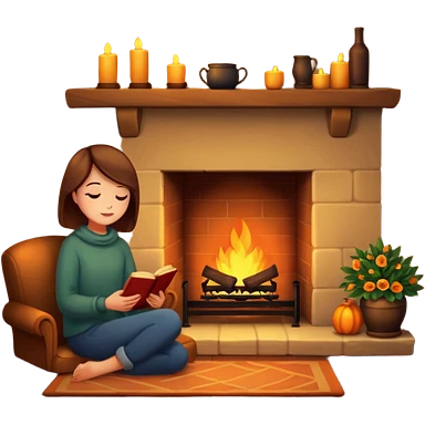 Cozy handsome 45 year old man sitting next to a nice fireplace with a hot apple cider, book, and plate of chocolate cookies. emoji
