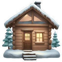 Warm wooden cabin with front porch under a mango tree branch, sunset sky in the background. Cozy, peaceful, emoji-style with soft edges and golden tones. emoji