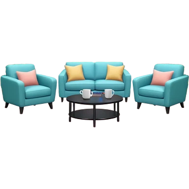 Morning entertainment TV studio, cozy talk show set with armchairs and couch, guests sitting area, round glass coffee table, warm pastel colors, green and blue lighting panels, festive decorations, friendly daytime TV atmosphere, realistic broadcast studio, no branding. emoji
