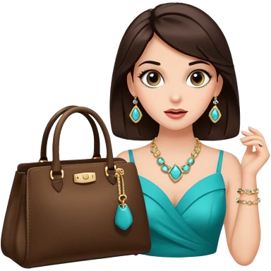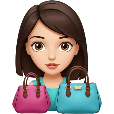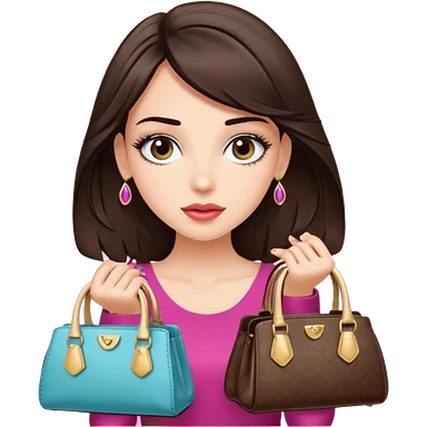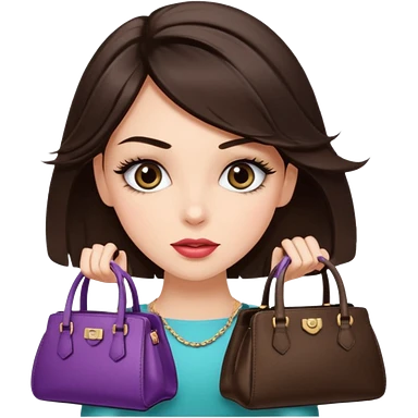 Glam brunette girl with eyelashes and fa looking left and right between two purses, playful puzzled expression — can’t decide between two options emoji