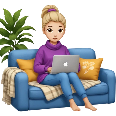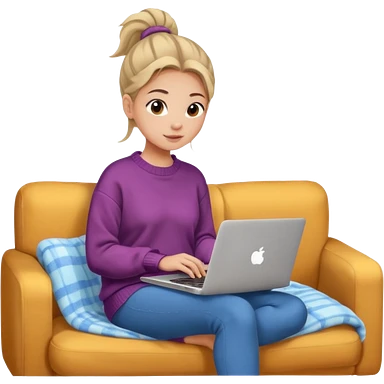 Cozy girl with ponytail on a cozy sofa with laptop on knees and a warm blanket, relaxed online shopping from home emoji | AI Emoji Generator