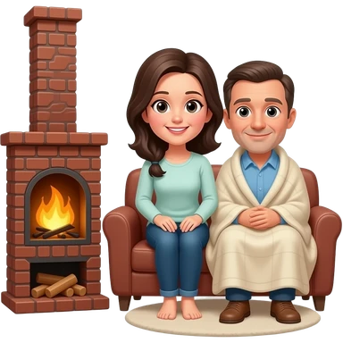 woman with dark hair with her husband at home near chimney watching movie under blanket cozy vibe emoji