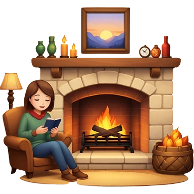 Cozy handsome 45 year old man sitting next to a nice fireplace with a hot apple cider, book, and plate of chocolate cookies. emoji