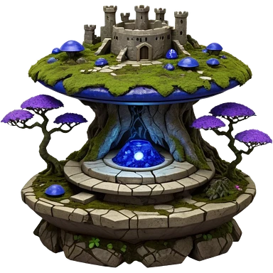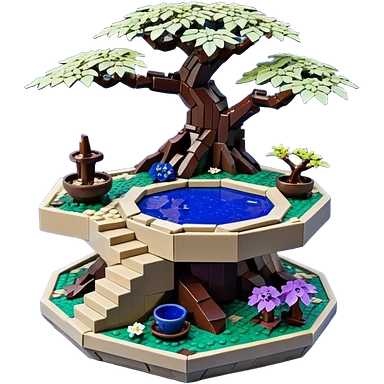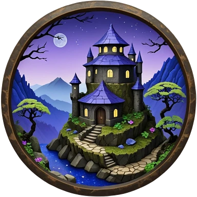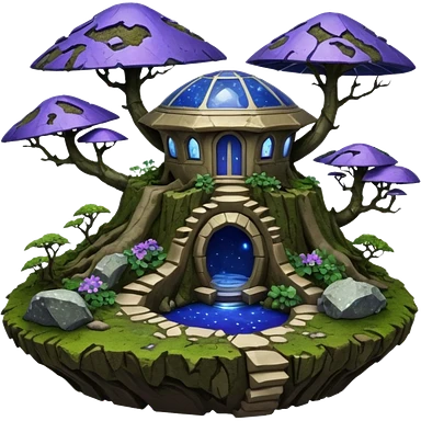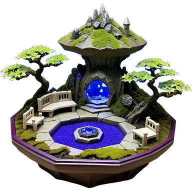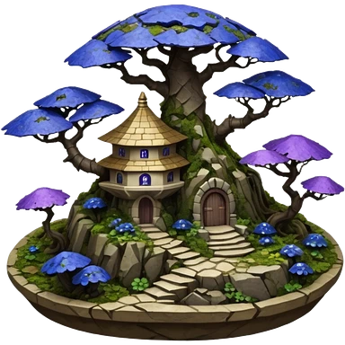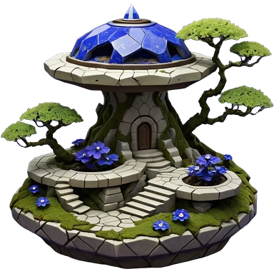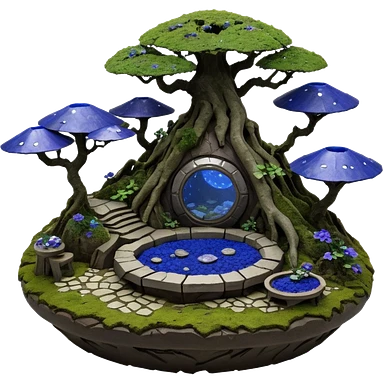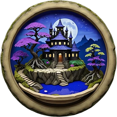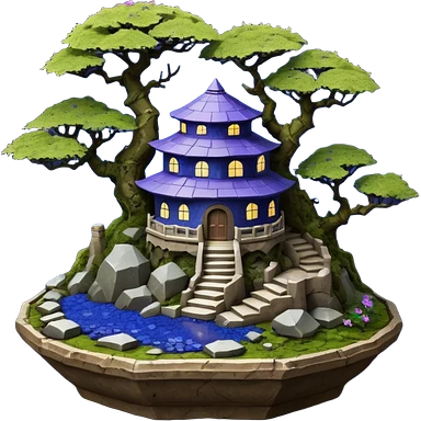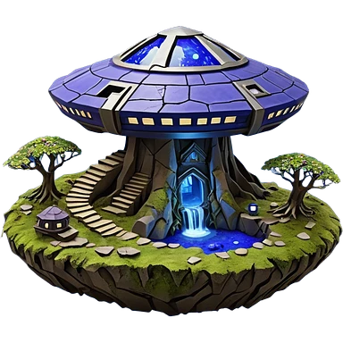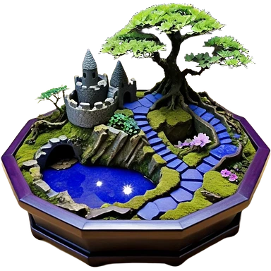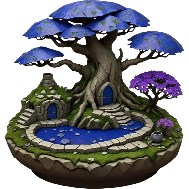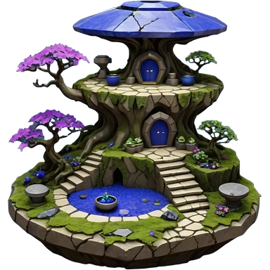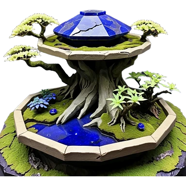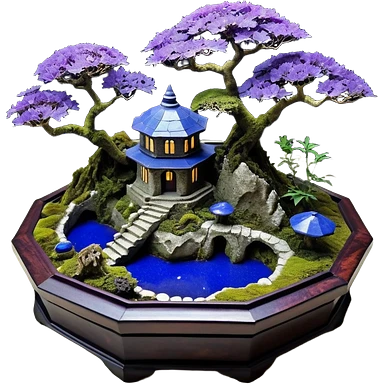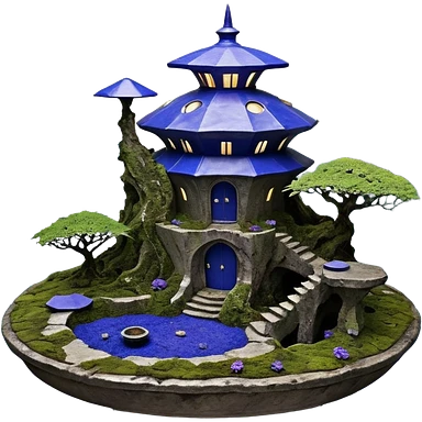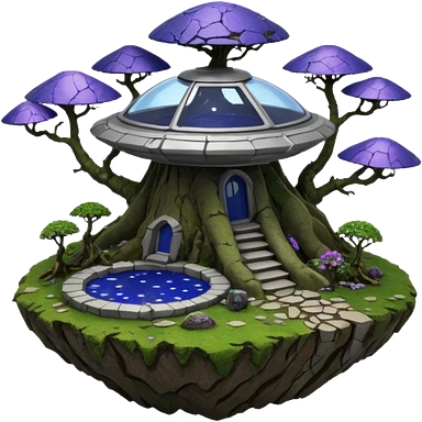 Crashed Alien saucer pool-castle jungle winding staircase mountainside getaway haunted nighttime landscape antique mudman very old broken cracked intricate Stone Age lapis-crusted irregular dodecagon-shaped shallow dark moss rough bark violet flowered maple tree bonsaiemoji