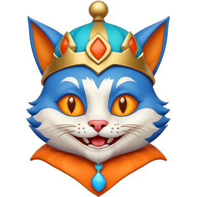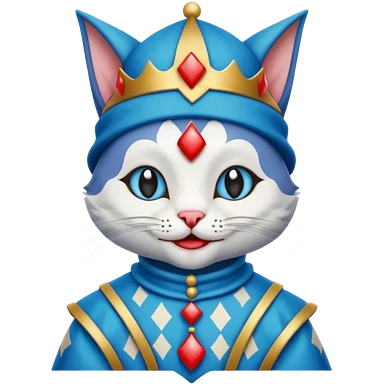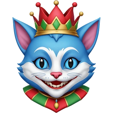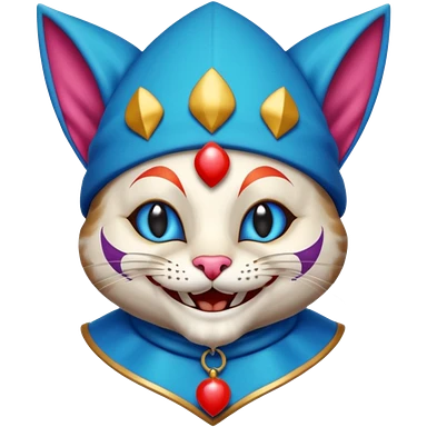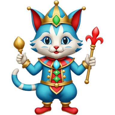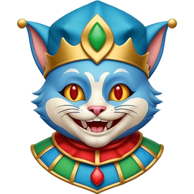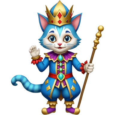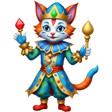 crazy colorful cute little cat jolly joker from poker, medieval, vintage, court jester, mac os icon, blue color, full body emoji | AI Emoji Generator