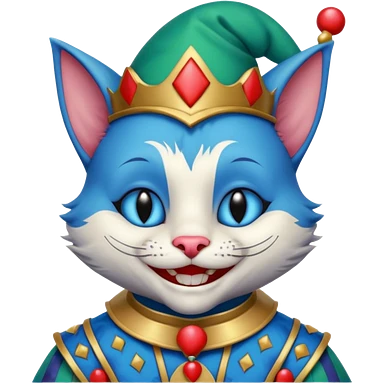 crazy colorful cute little cat jolly joker from poker, medieval, vintage, court jester, mac os icon, blue color, poker cards emoji