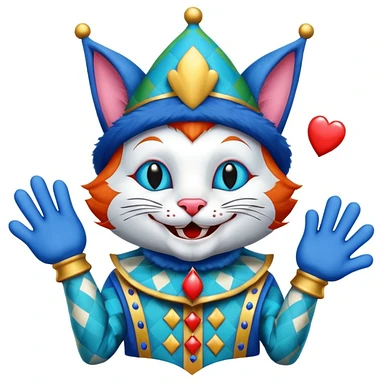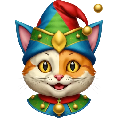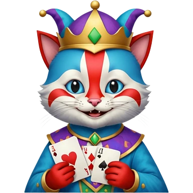 crazy colorful cute little cat jolly joker from poker, medieval, vintage, court jester, mac os squared icon, blue color emoji | AI Emoji Generator