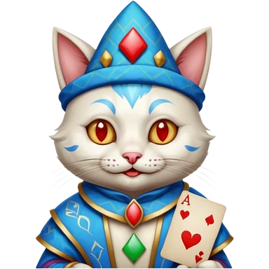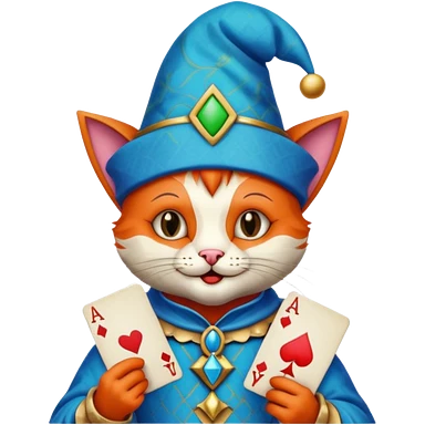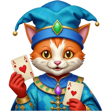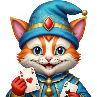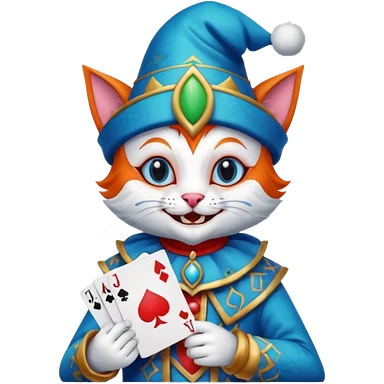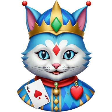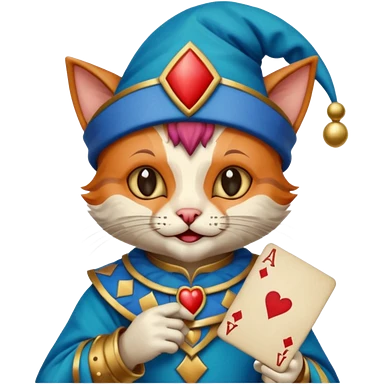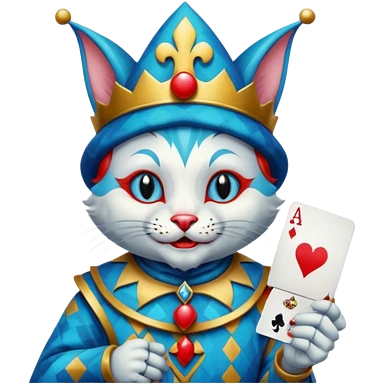 crazy colorful cute little cat jolly joker from poker, medieval, vintage, court jester, mac os icon, blue color, holds an ace poker card (clearly detailed and precise) emoji | AI Emoji Generator