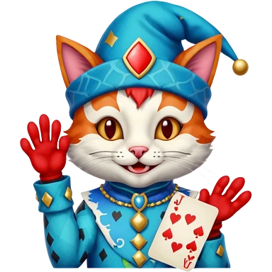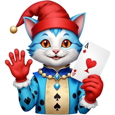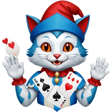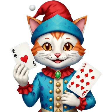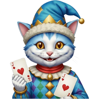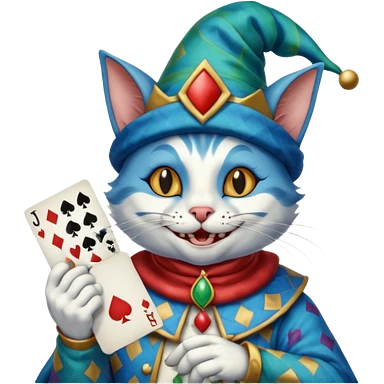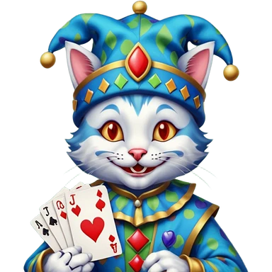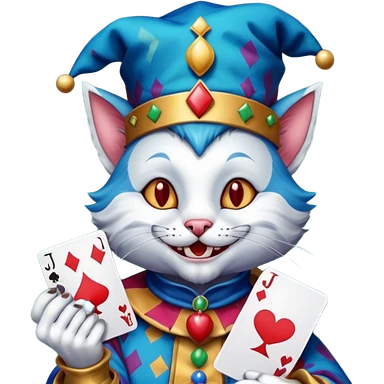 crazy colorful cute little cat jolly joker from poker, medieval, vintage, court jester, mac os icon, blue color, holds a single poker card emoji | AI Emoji Generator