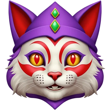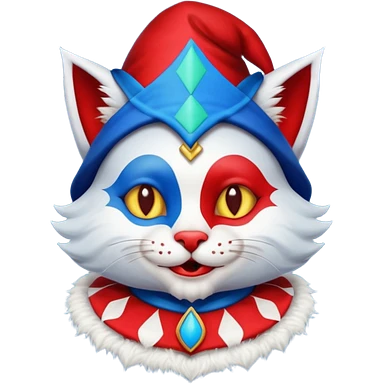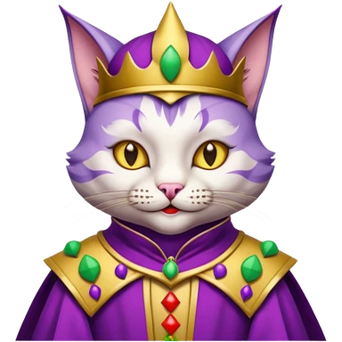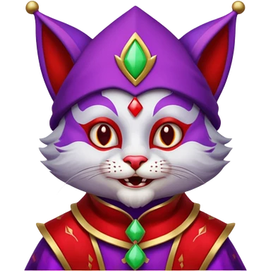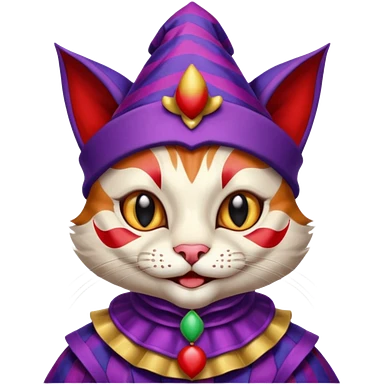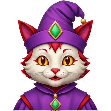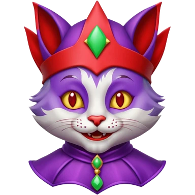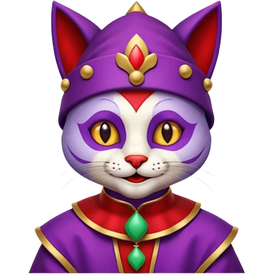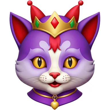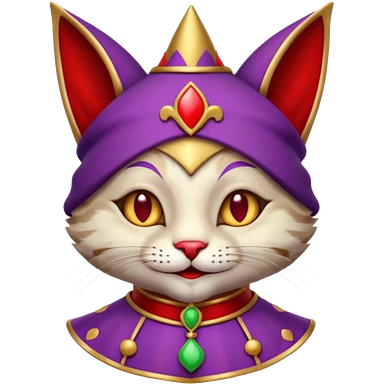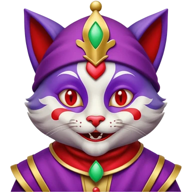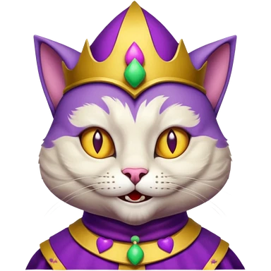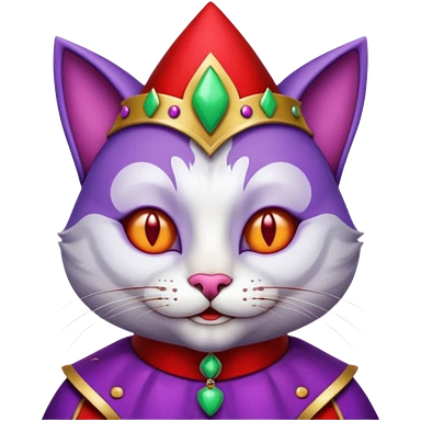 crazy colorful cute little cat jolly joker from poker, medieval, vintage, court jester, mac os icon, purple and red color, silver inserts, half body emoji | AI Emoji Generator
