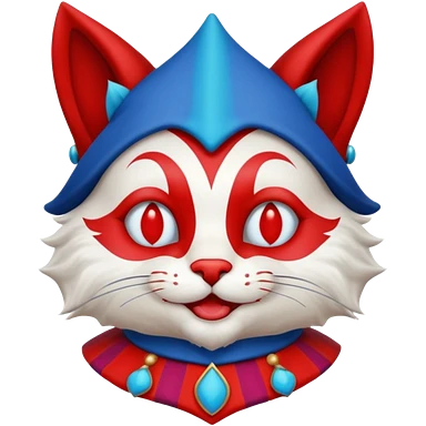 crazy colorful cute little cat jolly joker from poker, medieval, vintage, court jester, mac os icon, blue color, half body emoji | AI Emoji Generator