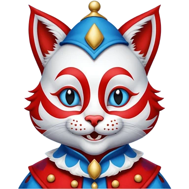 crazy colorful cute little cat jolly joker from poker, medieval, vintage, court jester, mac os icon, blue and red color, half body emoji | AI Emoji Generator