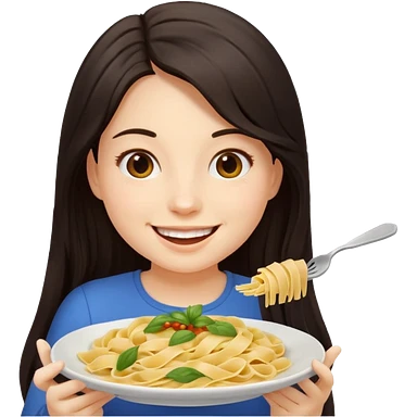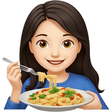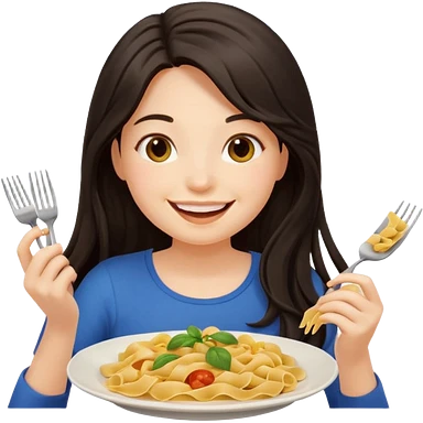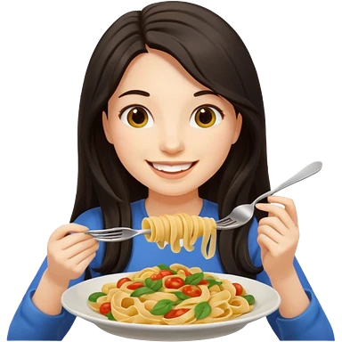 chica joven con piel clara y pelo oscuro largo comiendo un plato de pasta que parezca un emoji de iphone (sistema ios) emoji