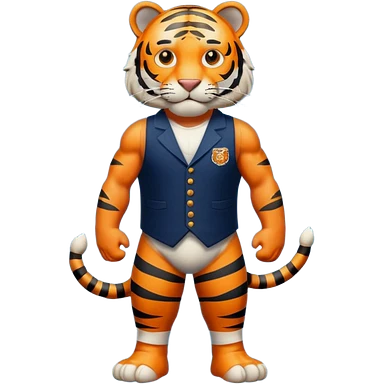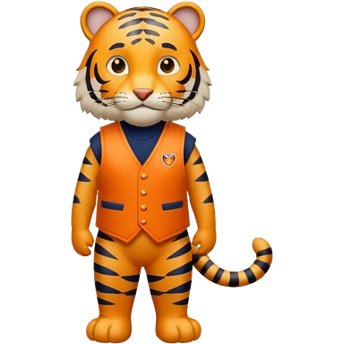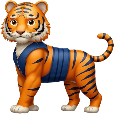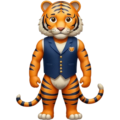crea un tigre de cuerpo completo, que lleve un chaleco color azul marino y que en el chaleco lleve el nombre (telamon) emoji