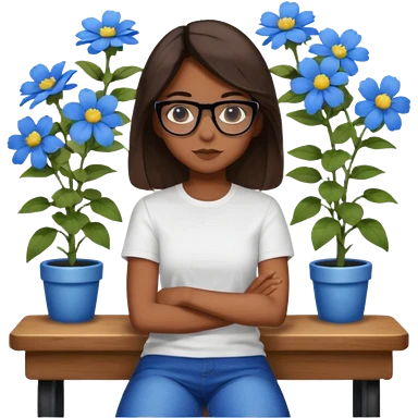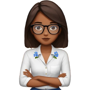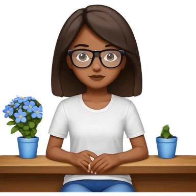 Créame una chica morena de pelo más o menos por los hombros con granitos en la cara y unas gafas negras, que esté sentado en una silla de bar con una camisa blanca con florecitas azules emoji