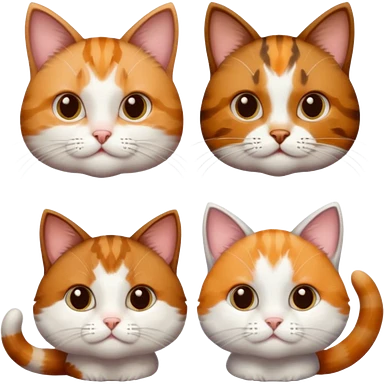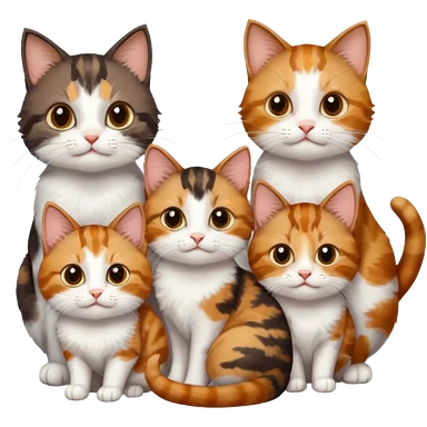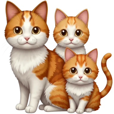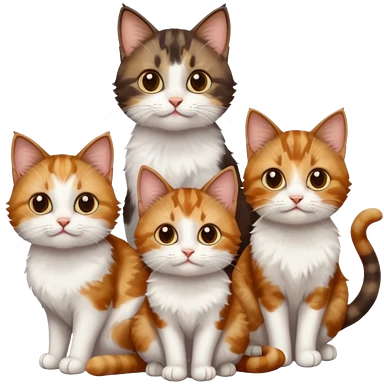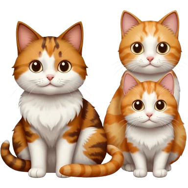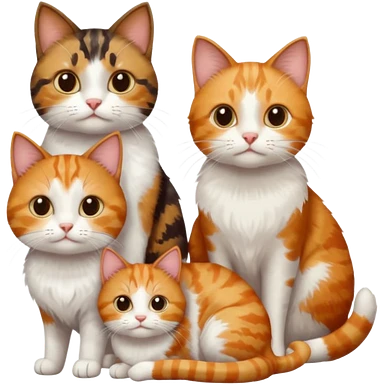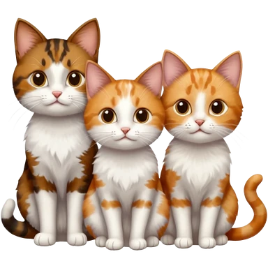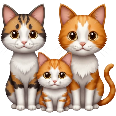 3 different coloured small cats including a dark brown tabby and white, and a patchy calico, and a ginger and white emoji
