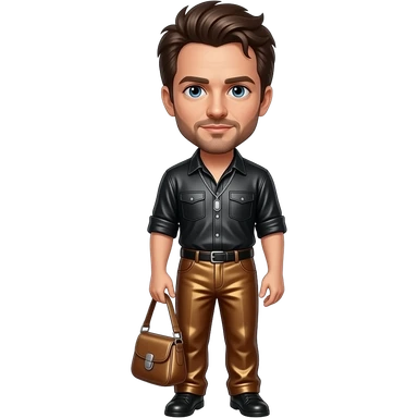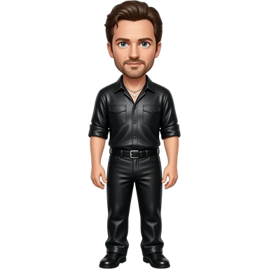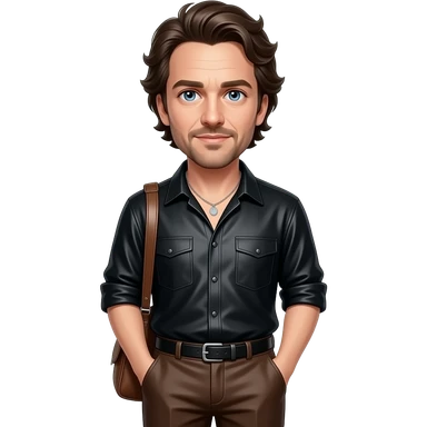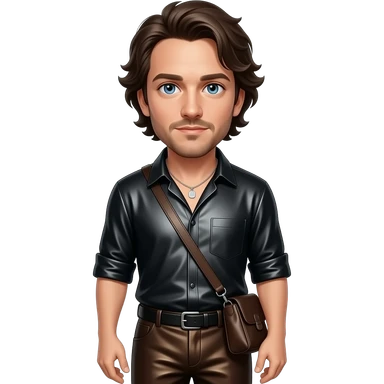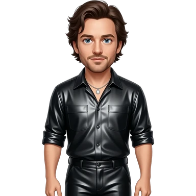 Ethan Hawke with blue eyes, dark brown hair, black metallic shirt, brown metallic baggy pants, silver necklace emoji