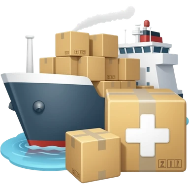 Create an emoji that shows a cargo ship with export boxes, a smaller import box, and a plus sign. emoji